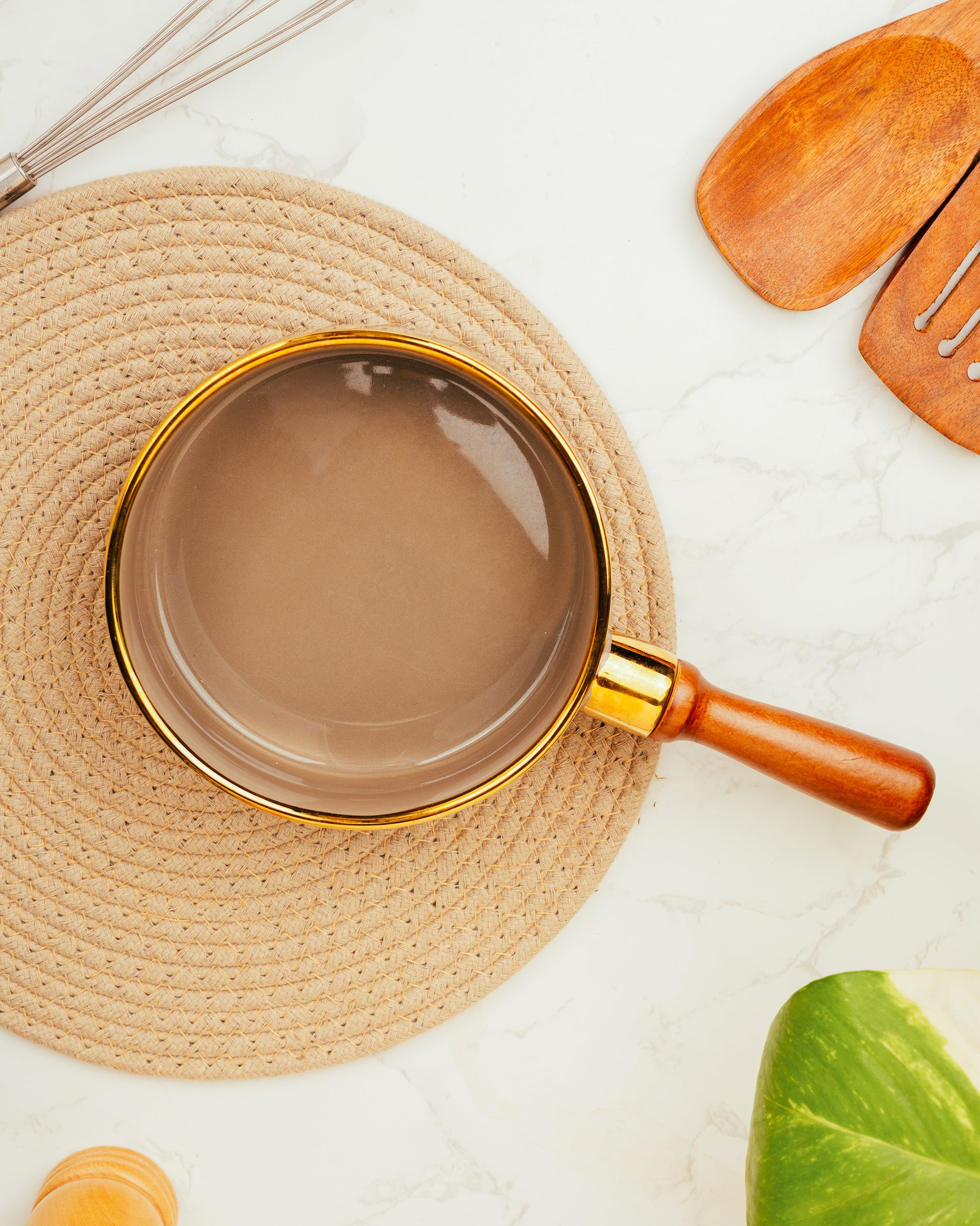 Ceramic Serving Bowl with golden rim and a wooden handle