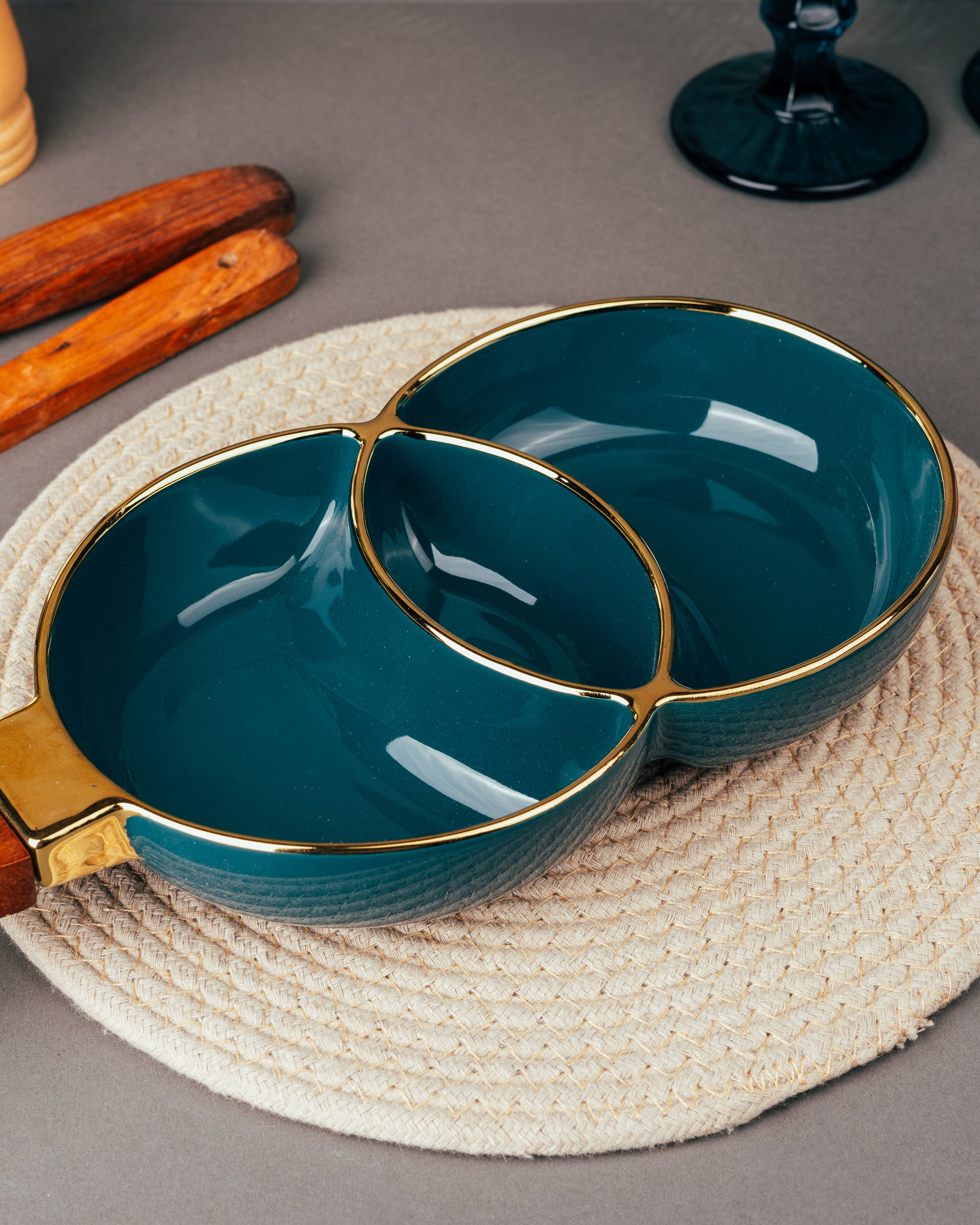 Dark blue tri-section section bowl with a gold rim and a wooden handle (Set of 1)